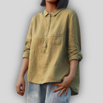 Klasická lněná blůza, která vyzařuje diskrétní eleganci a každodenní pohodlí. Má klasický límec s knoflíky vpředu a praktickou kapsu na hrudi. Uvolněný střih a dlouhé rukávy s možností ohrnutí ji činí ideální pro všechny hodiny dne.