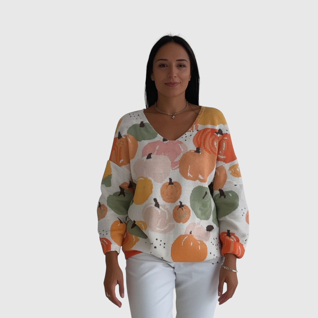 Podzimní pohodlí: Pletený svetr s V výstřihem a vzorem dýní v pastelových barvách