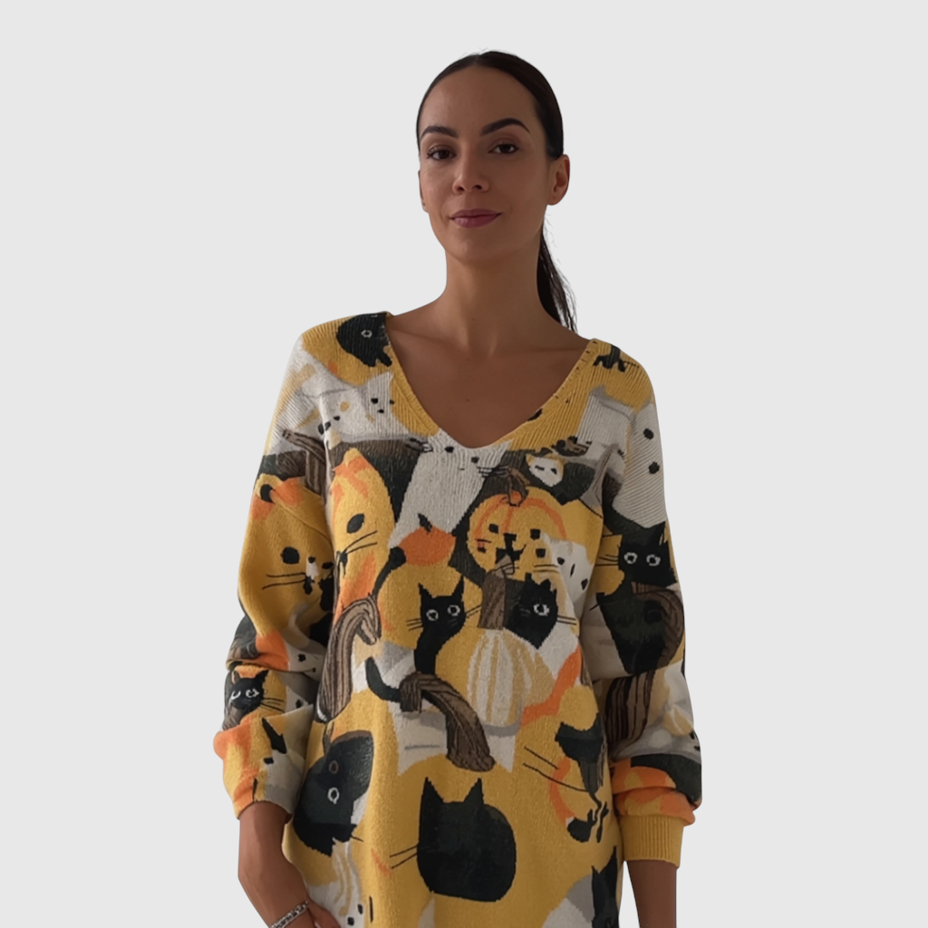 Zábavný detail: Pletený svetr s výstřihem do V a celoplošným vzorem koček v teplých barvách