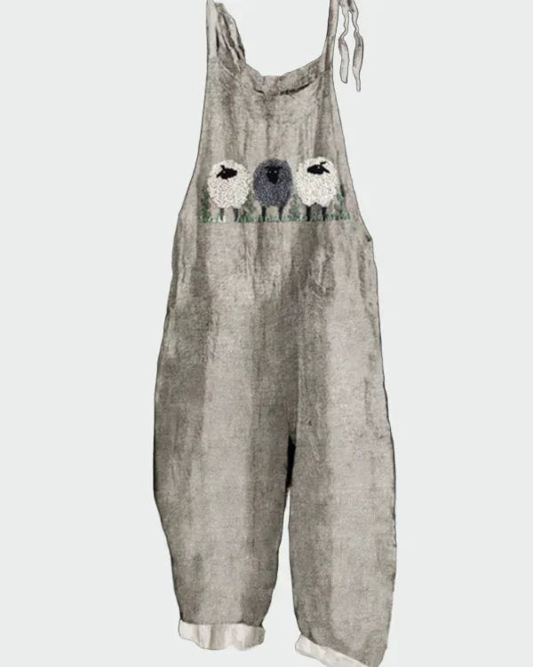 Retro overal se třemi ovečkami na hrudi nabízí sladkou a hravou estetiku, ideální pro každodenní chvíle pohody.