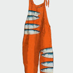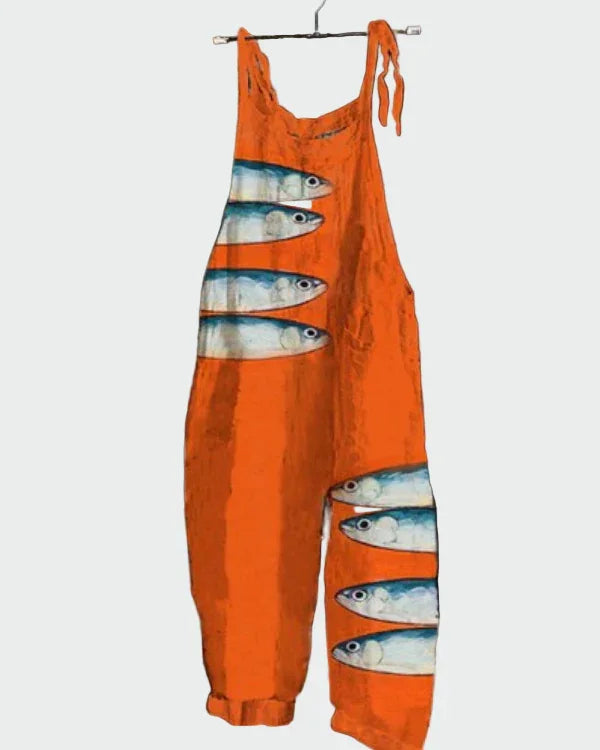 Retro overal s širokými nohavicemi inspirovaný mořskou estetikou je výrazný kousek, který oživí každý šatník. Jeho výrazná oranžová barva a umělecký potisk s rybami okamžitě zaujmou a dodají vašeho looku šarm a originalitu.