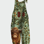 Objevte retro šarm v overalu s vyšívanými květy, inspirovaným venkovskou elegancí. Tento kousek zobrazuje realistický motiv holštýnské krávy na zeleném pozadí s bylinkovými vzory a červenými květy, který vytváří jedinečný a umělecký vzhled.
