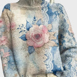 Romance Vintage: Pletený svetr s vysokým límcem, akvarelovým květinovým potiskem a krajkovými detaily (Lace Print)