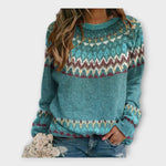 Svetr z turquoise modré pleteniny s geometrickým vzorem Fair Isle a kulatým výstřihem
