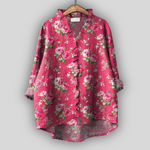 Romantická lněná blůza v intenzivní růžové barvě s květinovým vzorem růží, která vyzařuje ženskost a eleganci. V-krční výstřih s jemnými volány a volný střih poskytují pohodlí a vzdušný pocit, zatímco asymetrický lem s delší zadní částí dodává moderní charakter každému outfitu.