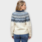 Pohodlí Zima: Pletený svetr s kulatým výstřihem a norským vzorem (Fair Isle) v modré a bílé barvě