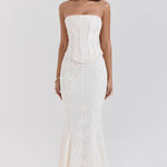 Denisa | Šaty s vyšívaným korzetem představují jemně elegantní a ženský kousek, který dokonale tvaruje siluetu a dodává neodolatelnou eleganci. Přiléhavý střih křivky a krajkové detaily dodávají romantiku a luxus.