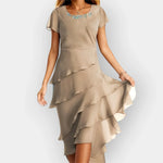 Objevte eleganci a pohodlí díky šifónovým šatům, které se díky lehkému vrstvě šifónu jemně pohybují s vámi a nabízejí diskrétní luxus a komfort. Vrstvené detaily jemně obepínají tělo a nadčasovou siluetu, která se skvěle hodí na večerní a slavnostní příležitosti.