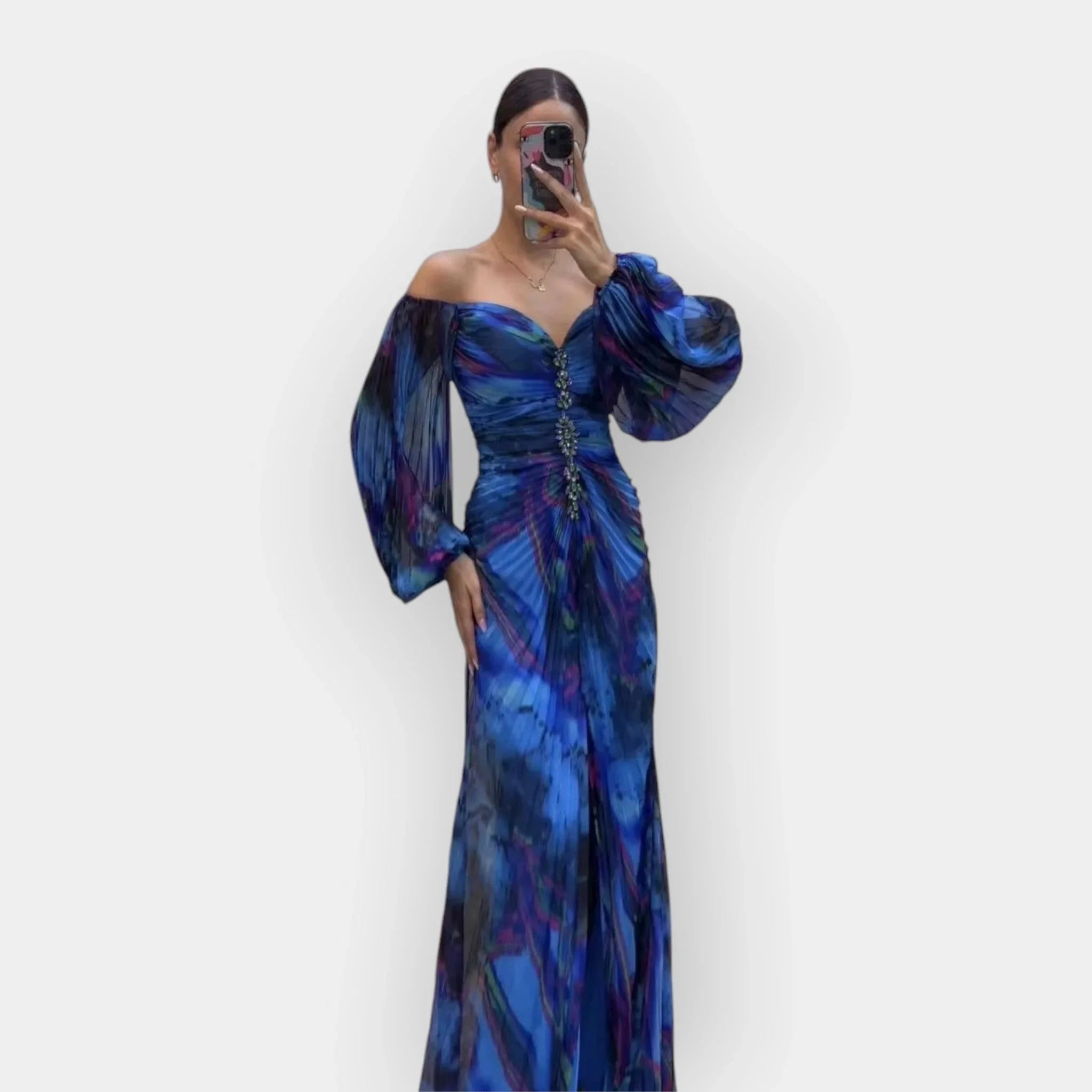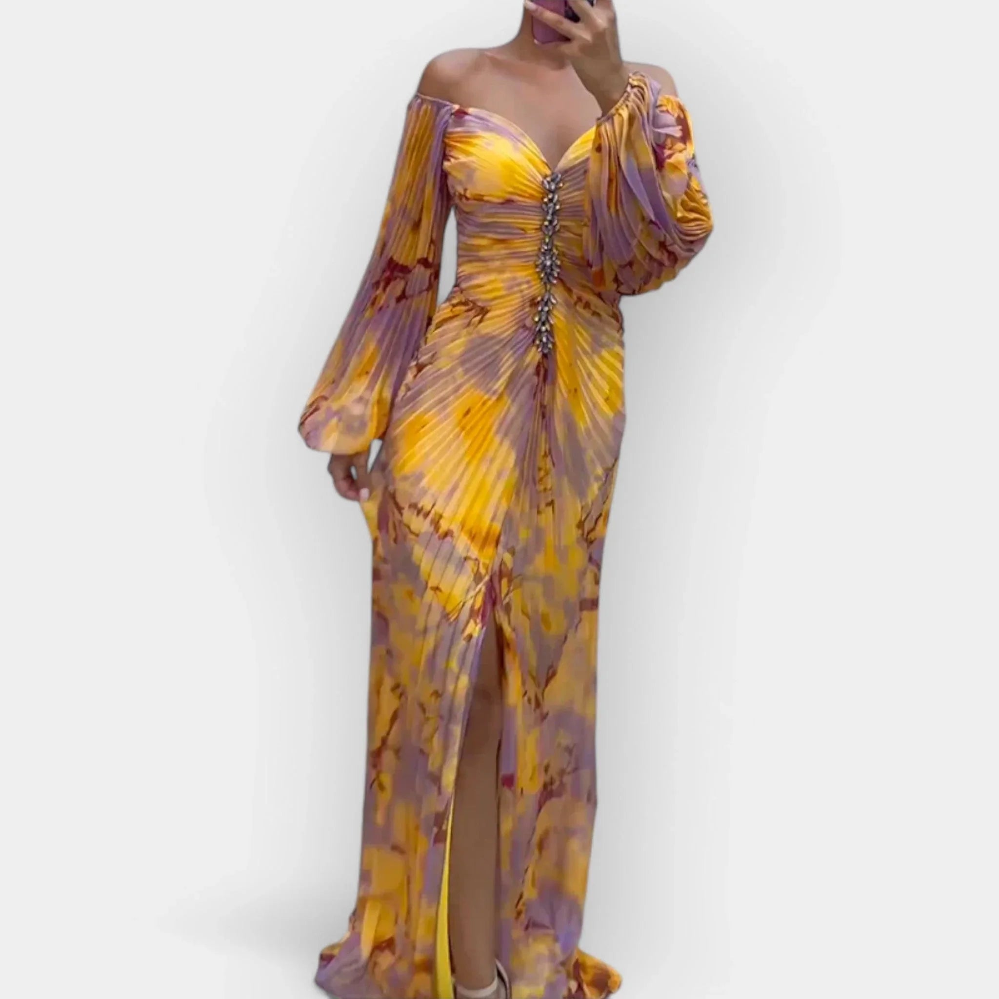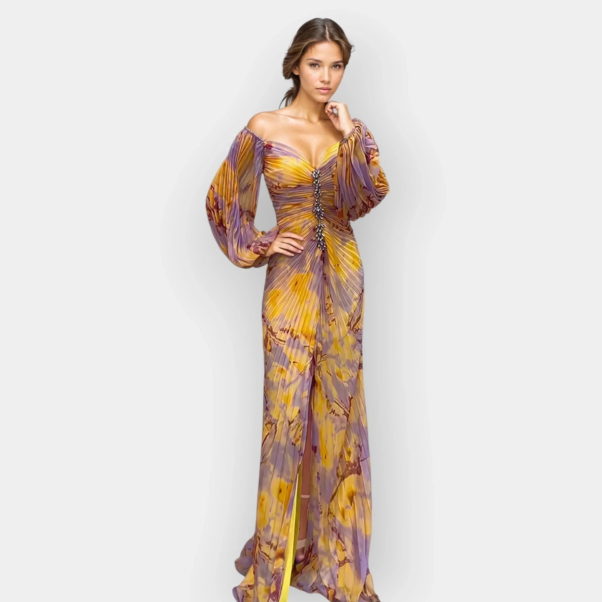 Umělecké dílo: Dlouhé plisované šaty s exkluzivním potiskem pro dramatický vzhled