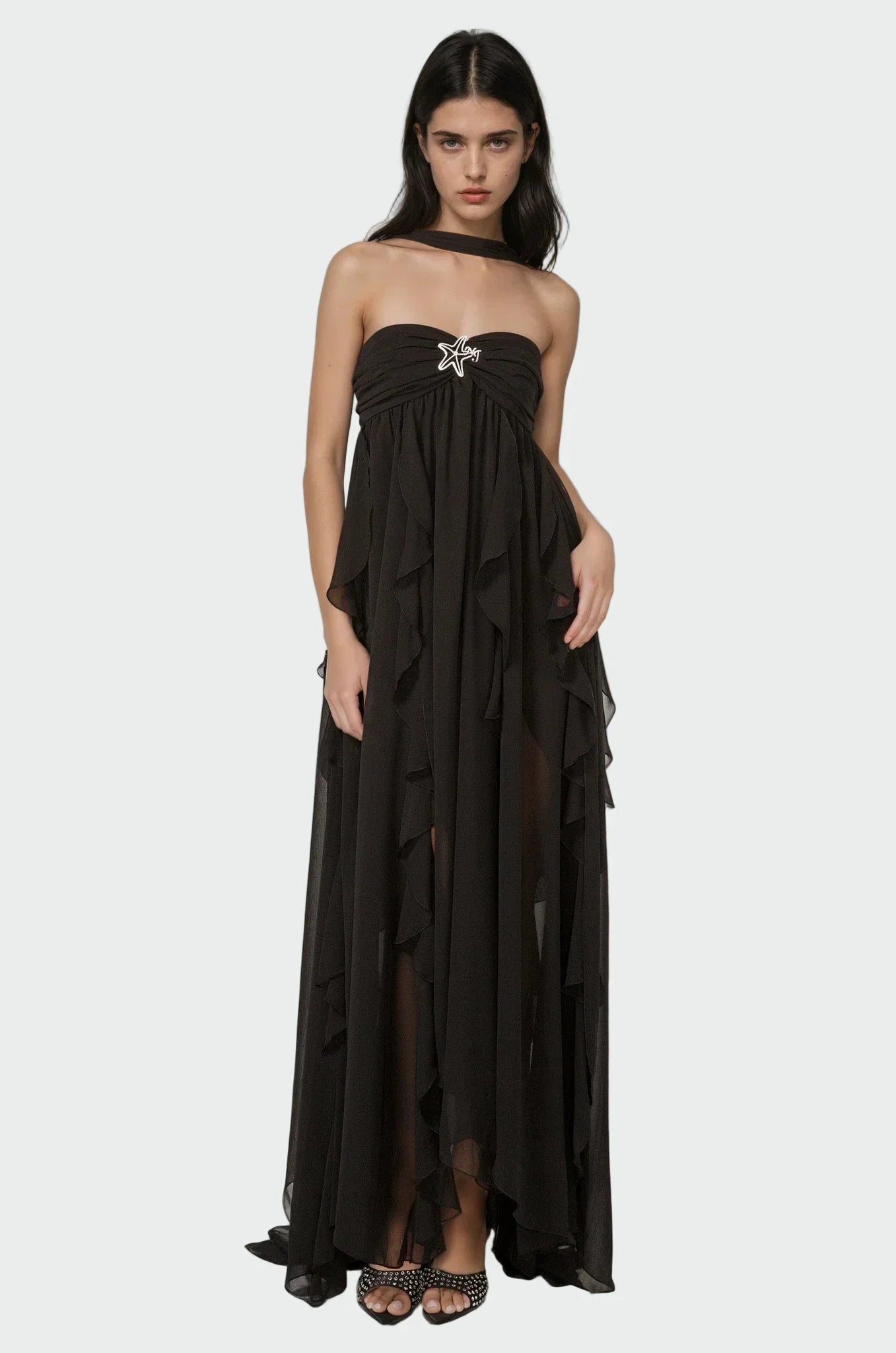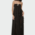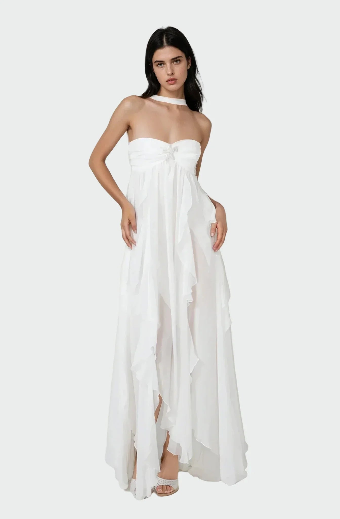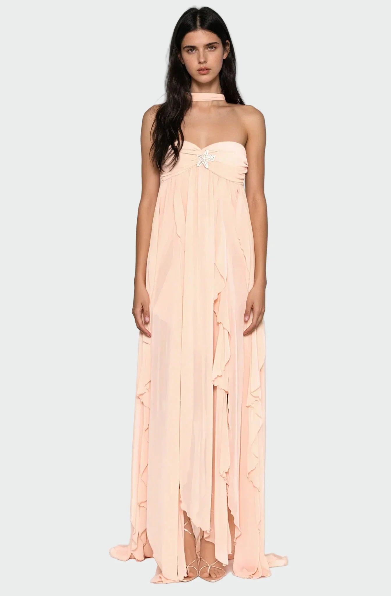 Lehká, mírně průsvitná elegance v kombinaci s jemnou podšívkou zajišťuje komfort po celý den i večer. Maxi délka s éterickým tokem umožňuje volný pohyb a současně působí velmi slavnostně. Skrytý zip zajišťuje dokonalé padnutí bez rušivých detailů, takže šaty vypadají dokonale a perfektně drží tvar.