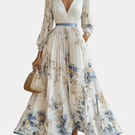 Dlouhé šaty s nabranými rukávy a výstřihem do V jsou ztělesněním ženské elegance. Hluboký dekolt, lehká plisovaná textura a decentní květinový vzor zajistí lehký, vzdušný pohyb a aristokratický styl pro každý okamžik.