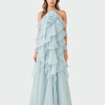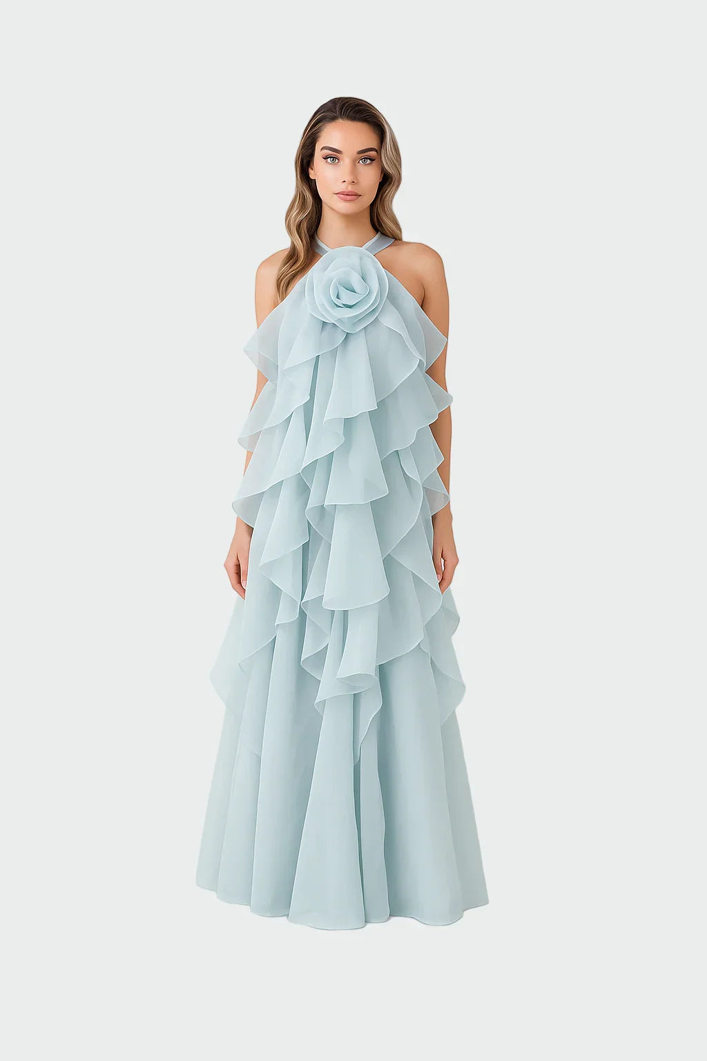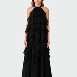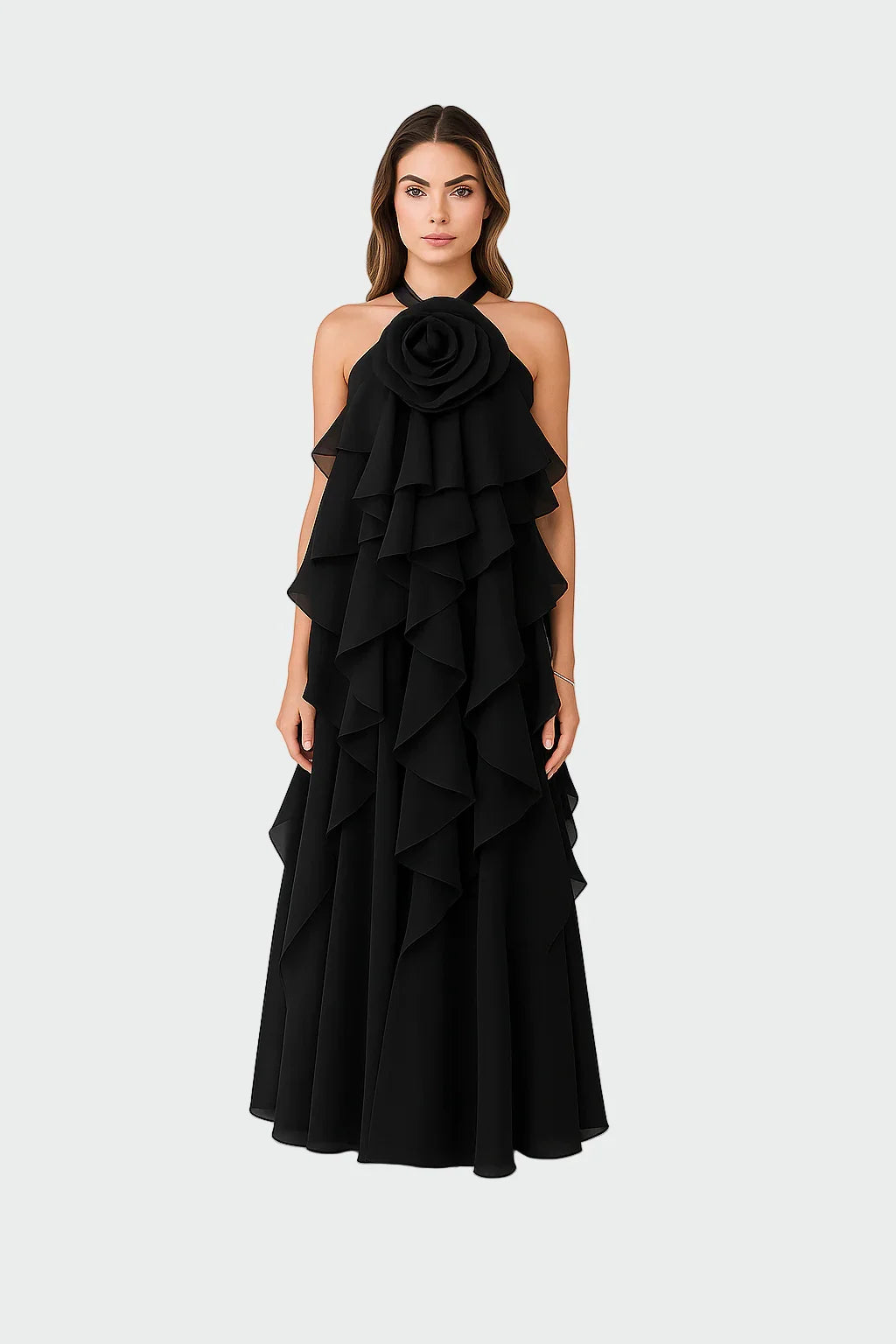 Květinové drama: Maxi šaty s kaskádou volánů a výraznou květinou