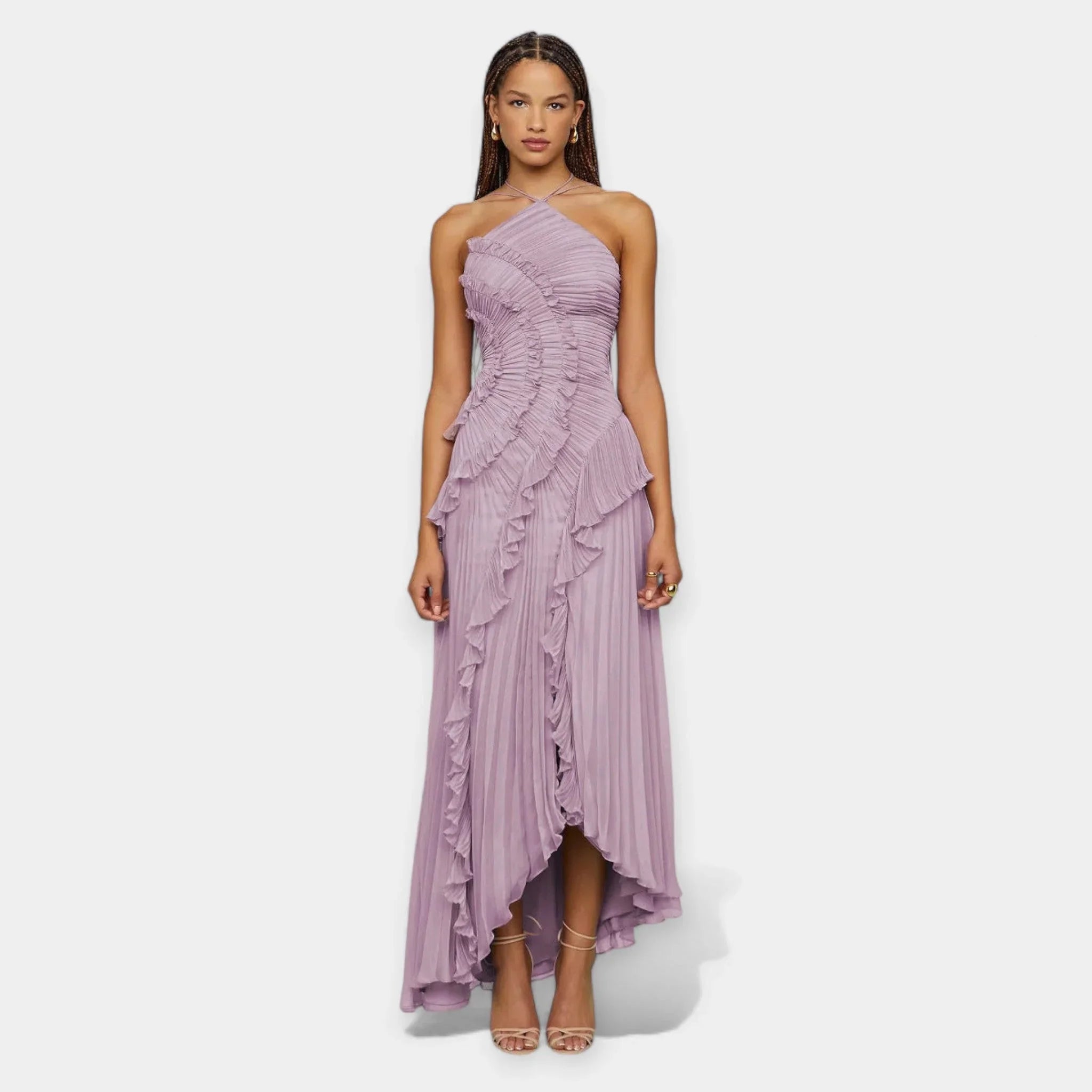 Okouzlující šaty s rafinovaně tvarovanými volány v jemných levandulových tónech, inspirované půvabem pohybu vodních lilijk. Tento kousek vyzařuje uměleckou jemnost a neodolatelnou ženskost, která podtrhne vaši osobnost při každé příležitosti.
