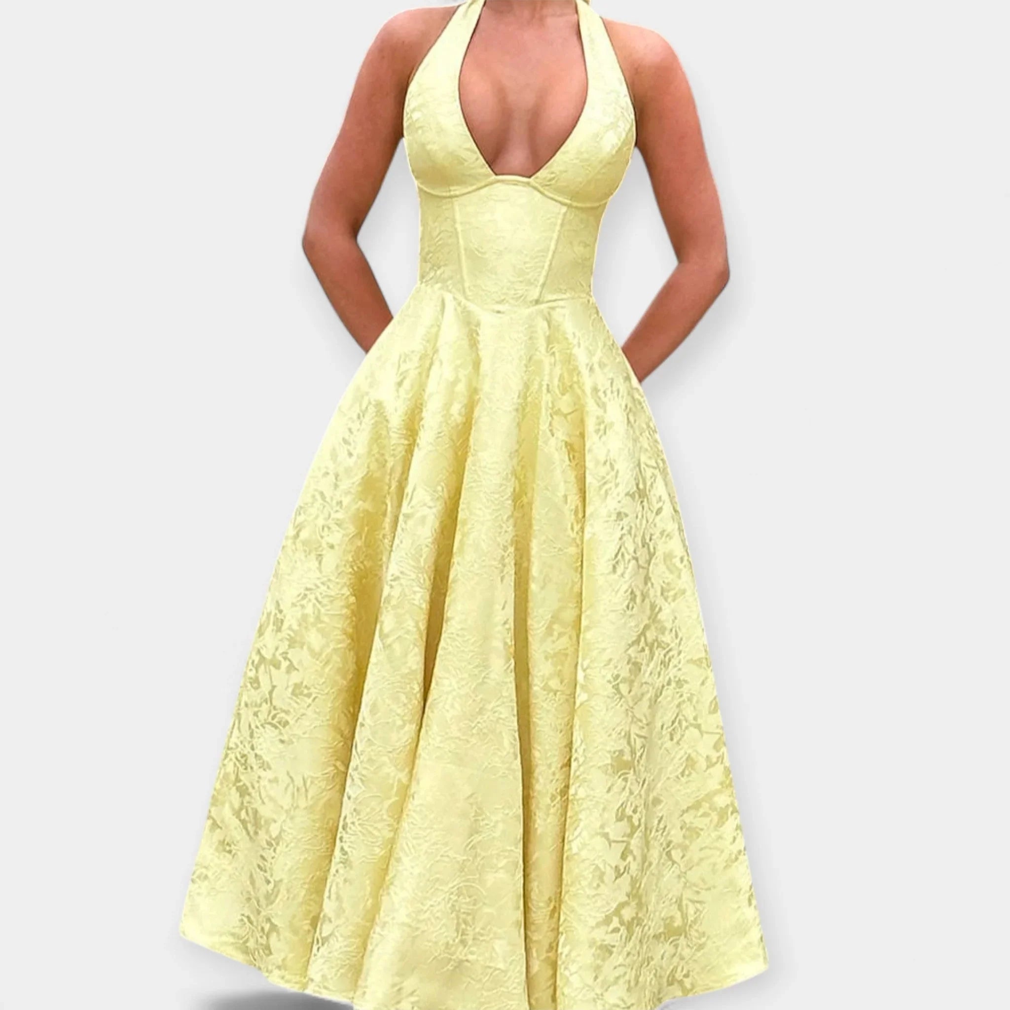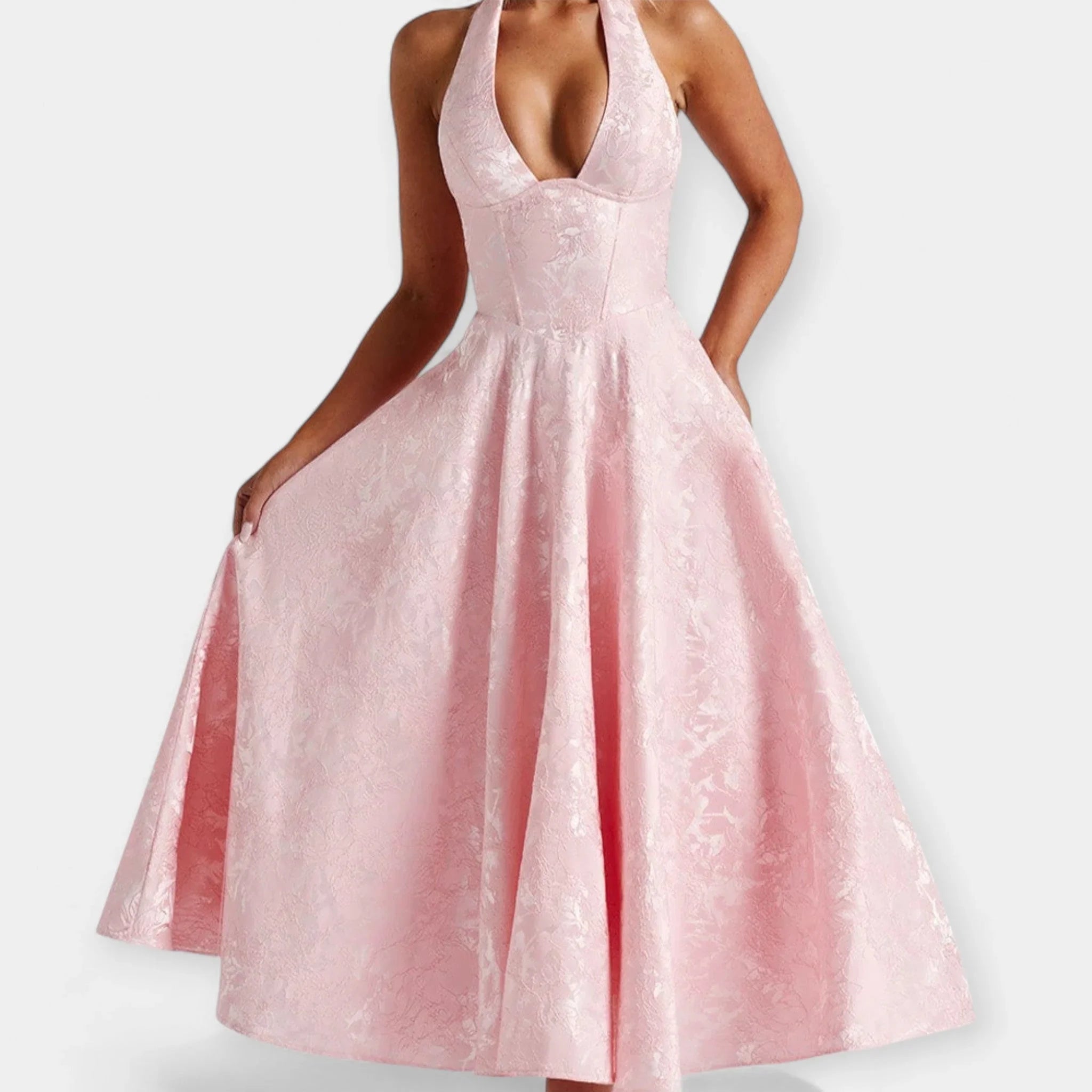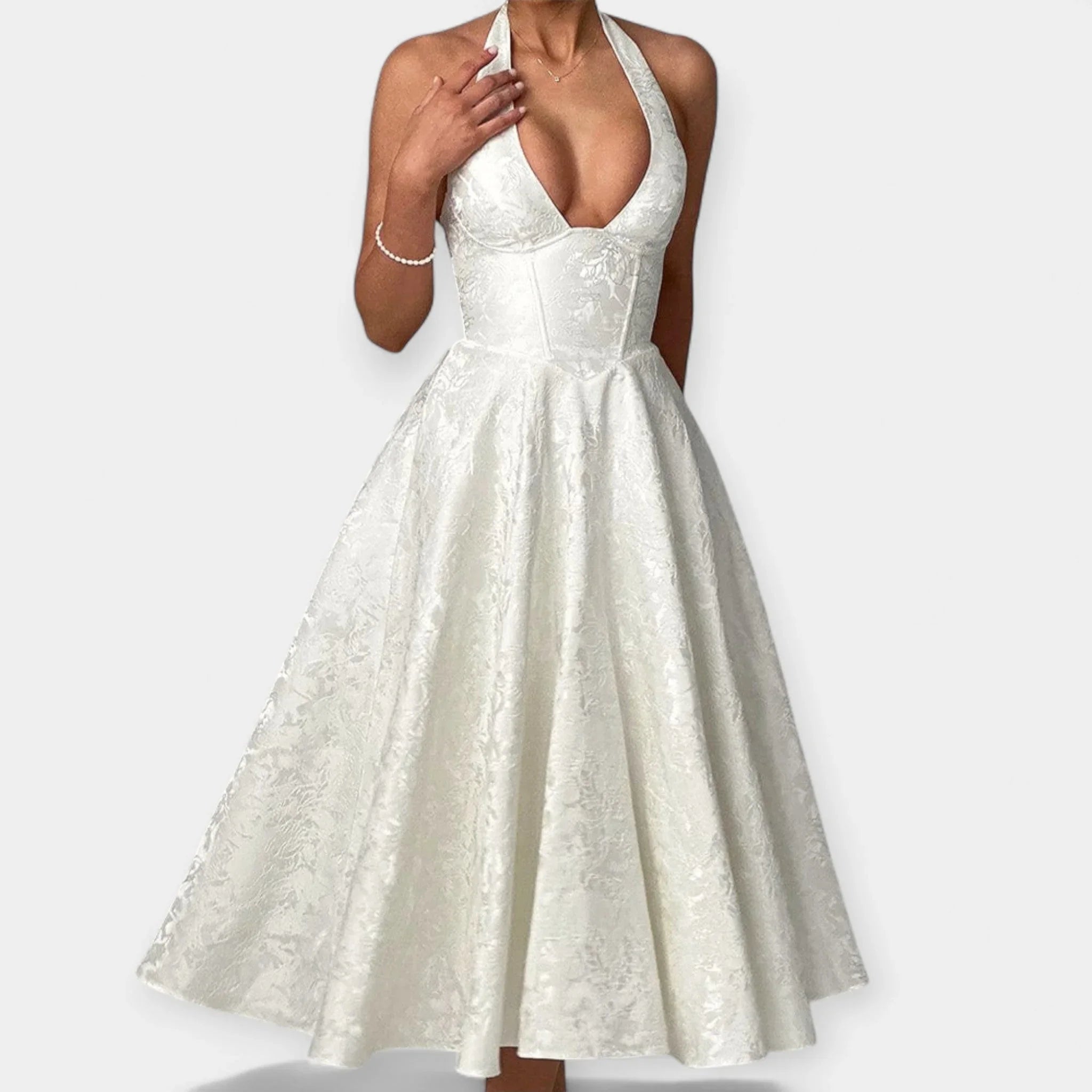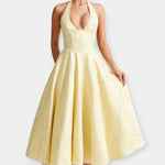 Nadčasová romantika: Midi šaty s halter výstřihem a kruhovou sukní z žakáru