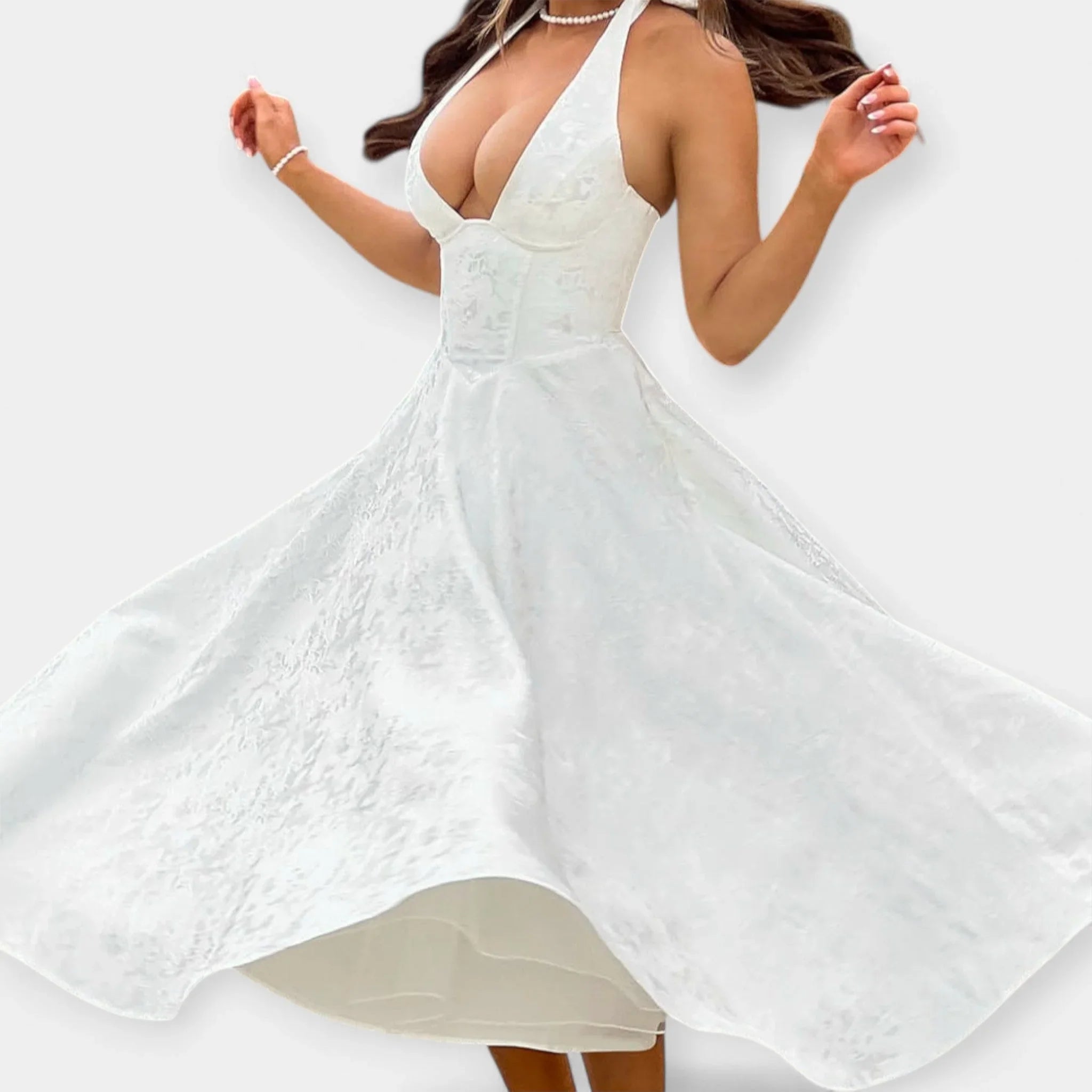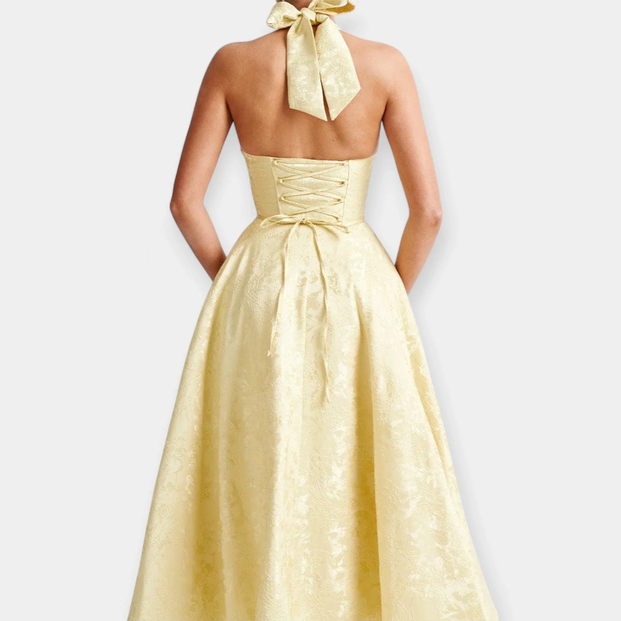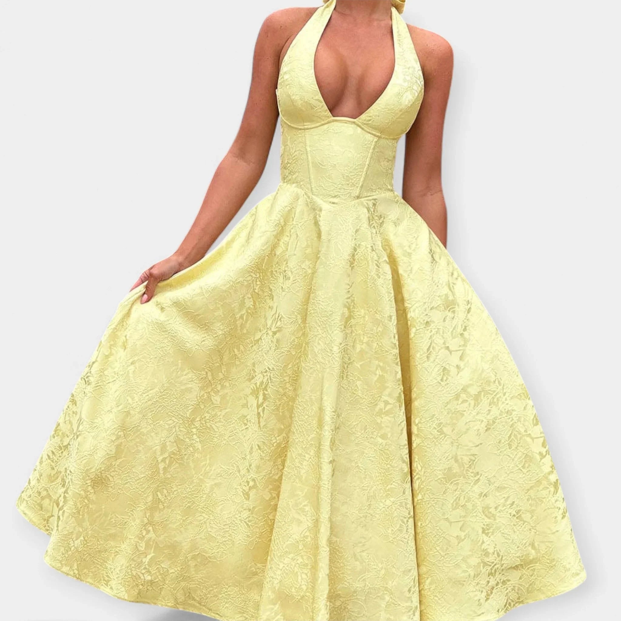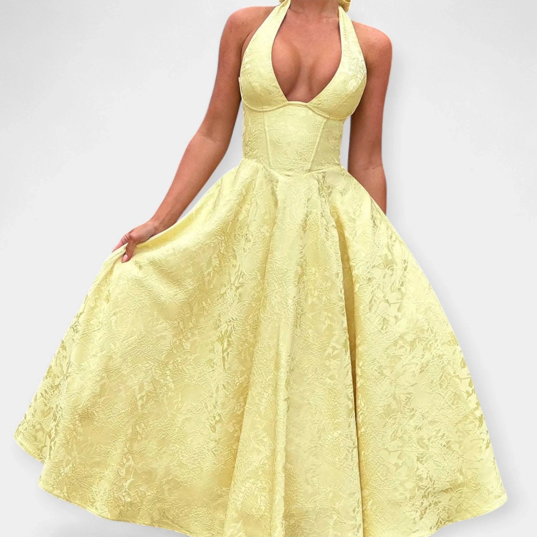 Nadčasová romantika: Midi šaty s halter výstřihem a kruhovou sukní z žakáru