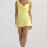 Mini šaty jsou hravé a ženské kousky, které spojují eleganci se světem. Asymetrický detail s volány na dekoltu dodává tomuto kousku jedinečný pohyb a styl, zatímco těsný střih zvýrazňuje postavu.