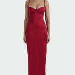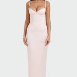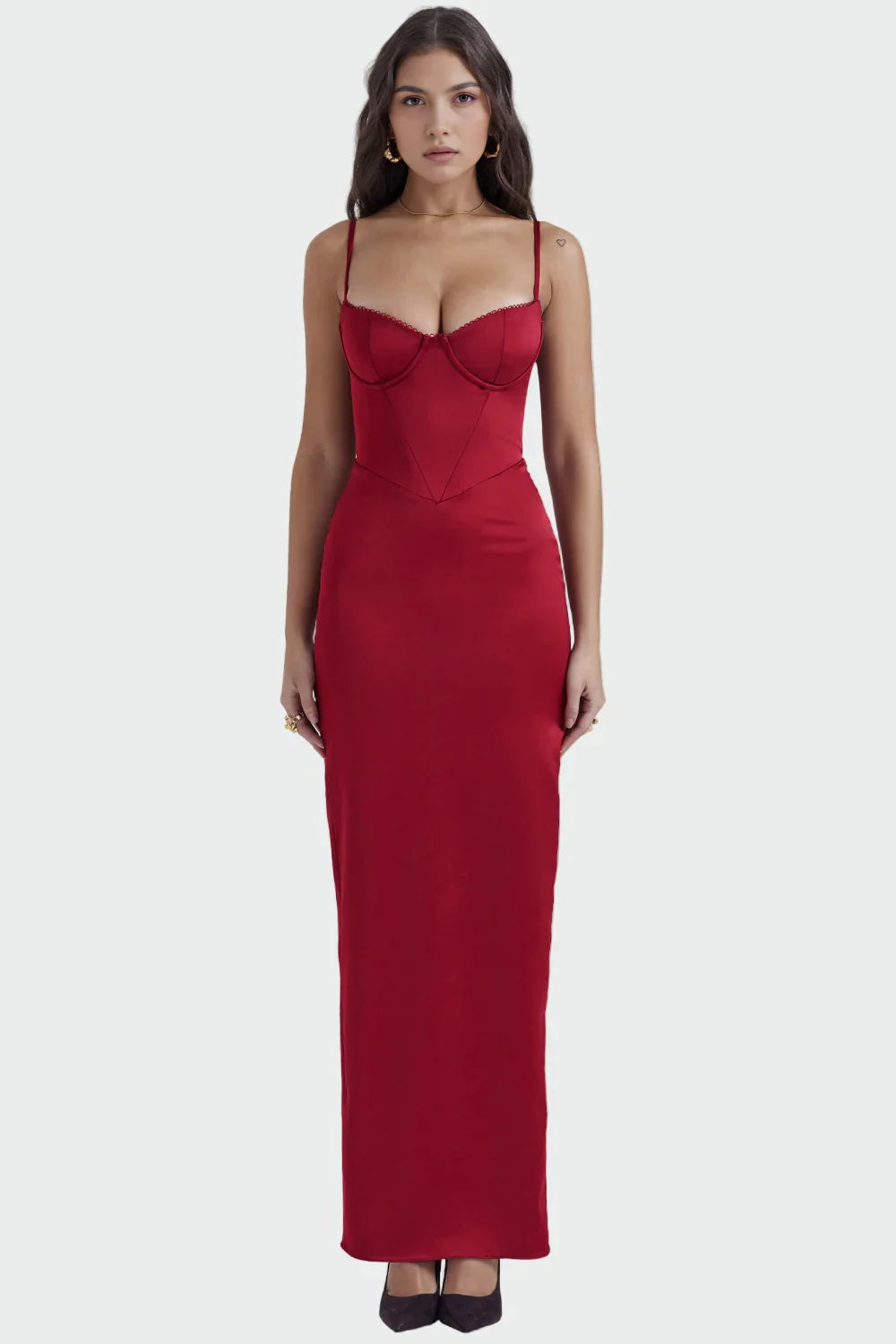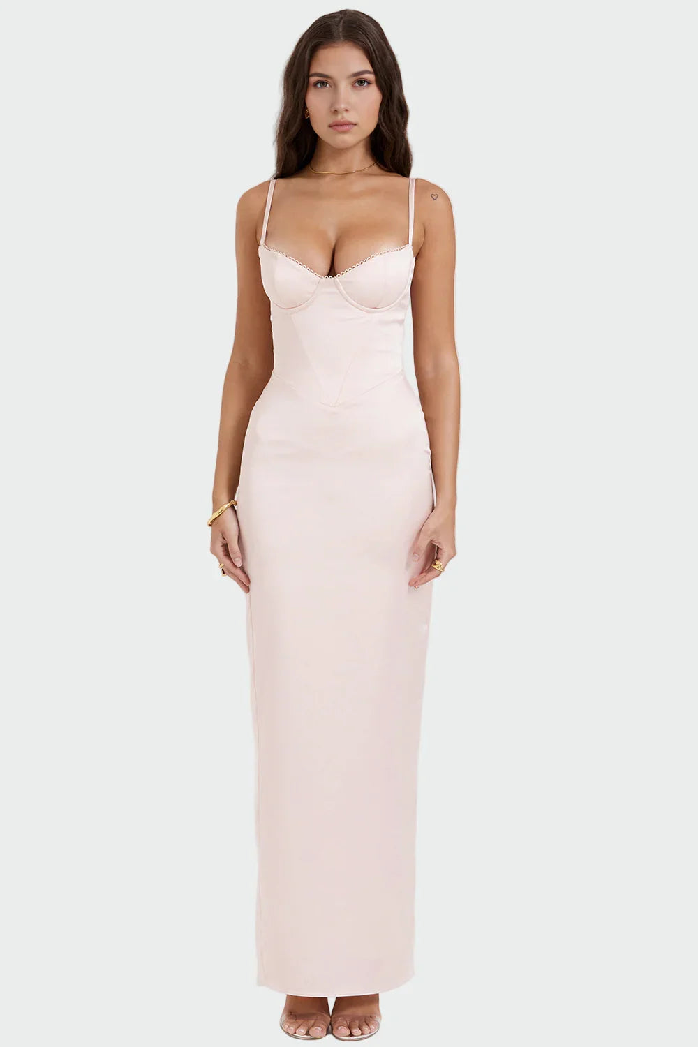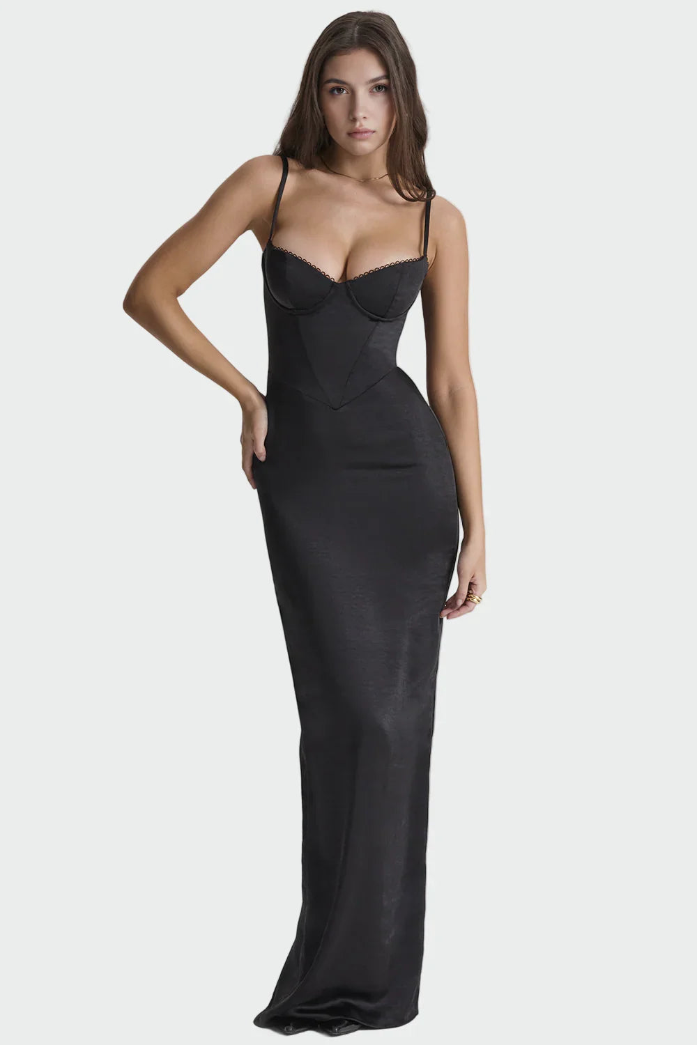 Minimalistická elegance: saténové maxi šaty se strukturovaným korzetem