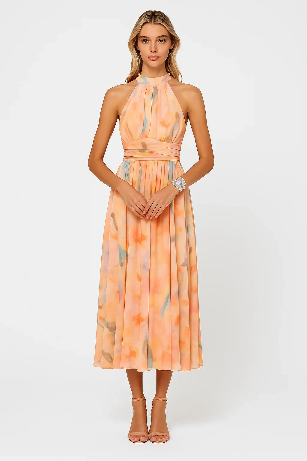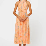 Květinová lehkost: Midi šaty s jemným potiskem a sofistikovaným halter výstřihem