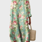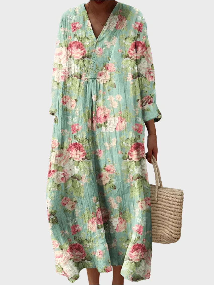 Romantika Vintage: Maxi květinové tunikové šaty s výstřihem do V a tříčtvrtečními rukávy
