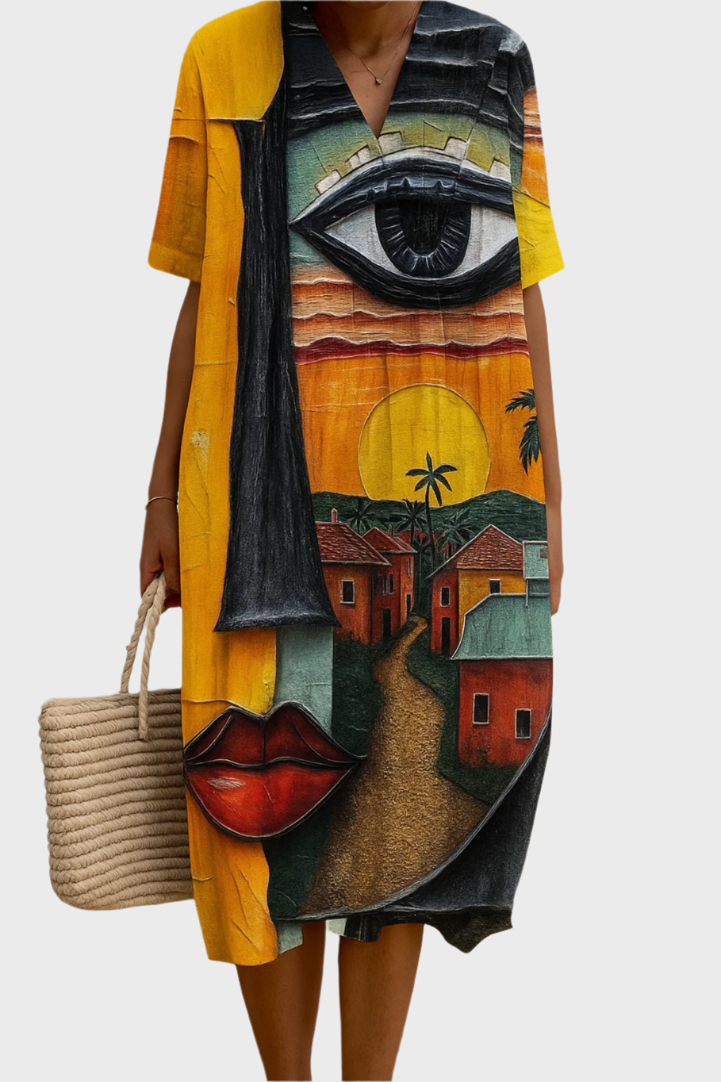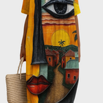 Umělecké dílo na nošení: Tunikové šaty s abstraktním potiskem obličeje a krajiny v kubistickém stylu