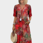 Objevte letní lehkost s šaty Florina, vzdušným modelem v živých barvách, který vyzařuje bezstarostnost a radost. S volným střihem a jemným V-dekoltem nabízejí eleganci a pohodlí od rána až do večera. Živý letní tisk v kombinaci červeného, zeleného a růžového výrazu, ale vyváženým motivem.