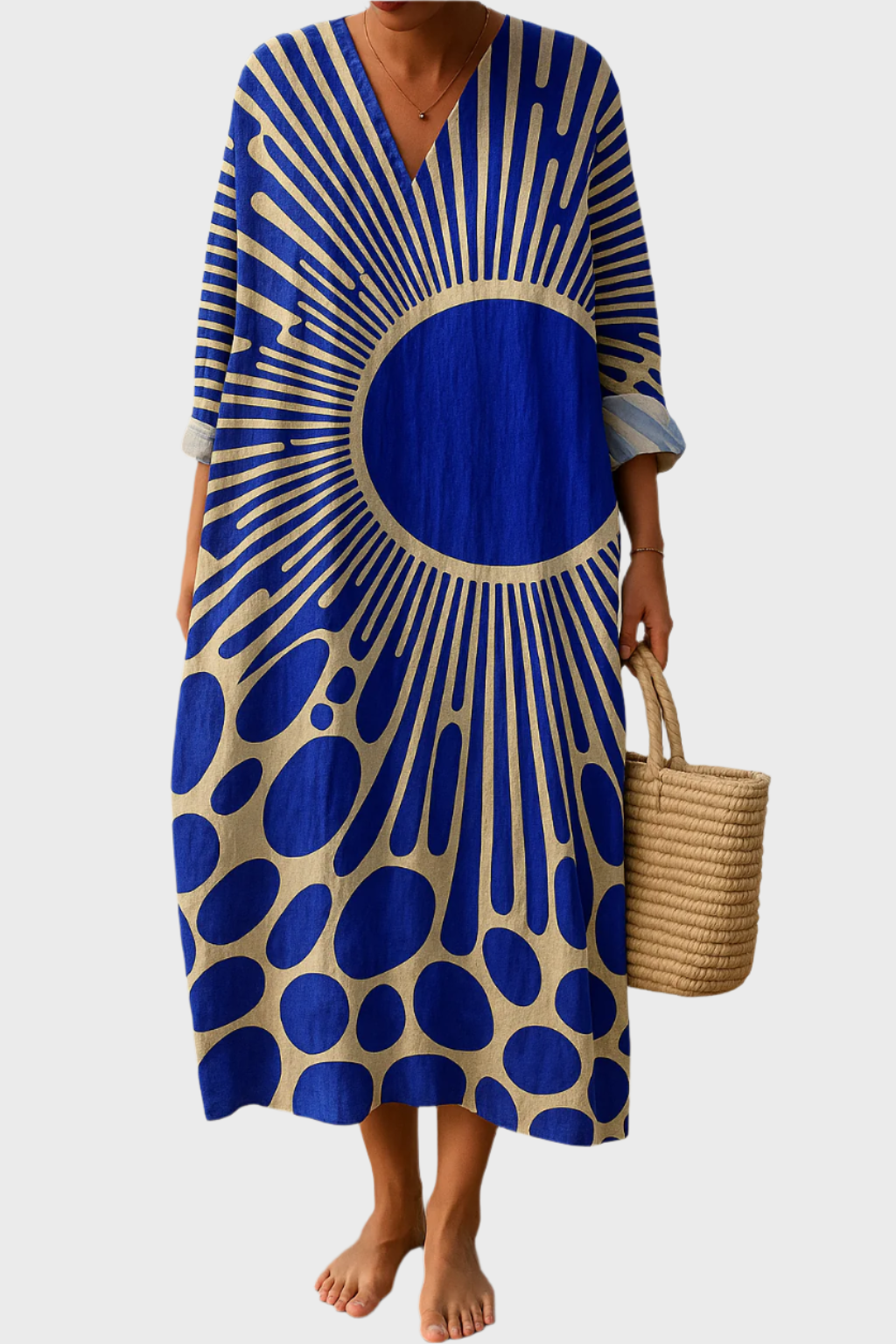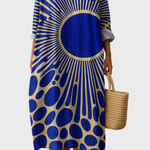 Grafický efekt: Maxi tunikové šaty s abstraktním slunečním potiskem a výstřihem do V
