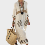 Styl Dovolená: Dlouhý pruhovaný bavlněný kaftan, výstřih do V a 3/4 rukávy